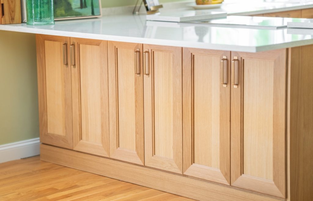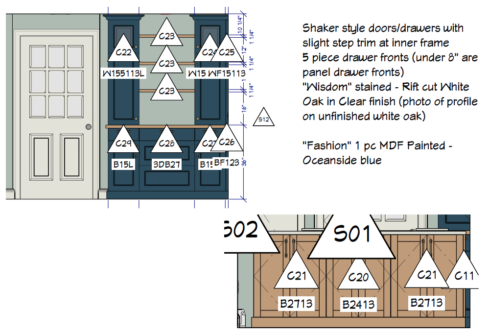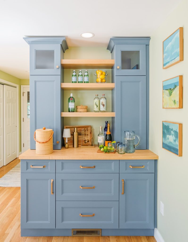 The finished bar area and the rear-facing cabinets beneath the extended counter overhang, as shown in the plans above.