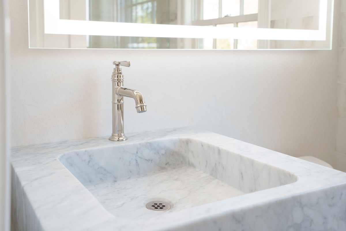 Carrera marble slabs were used to craft the stone vessel console sinks, which rest on custom polished nickel vanity legs by Palmer Industries. Additional design details include generous, matching shower and sink niches, as well as expansive 3-foot by 4-foot mirrors with integrated LED lighting, equipped with convenient on glass Kelvin adjustable dimmable controls—offering both style and function for daily routines.